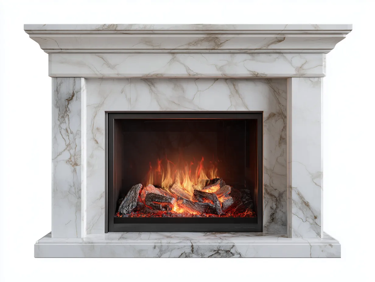 Struttura realizzata in marmo di colore bianco con venature naturali visibili. Le superfici sono lavorate con precisione per garantire una resa estetica uniforme e una finitura pulita. Il telaio frontale scuro definisce l'apertura del vano fiamma.