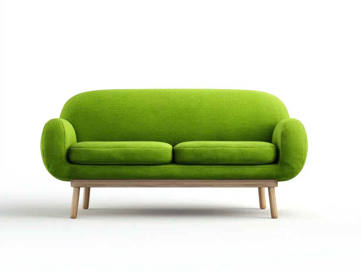 Rivestimento in tessuto di colore verde con imbottitura interna uniforme. La struttura è sostenuta da gambe in legno che garantiscono stabilità e solidità nell'uso quotidiano.